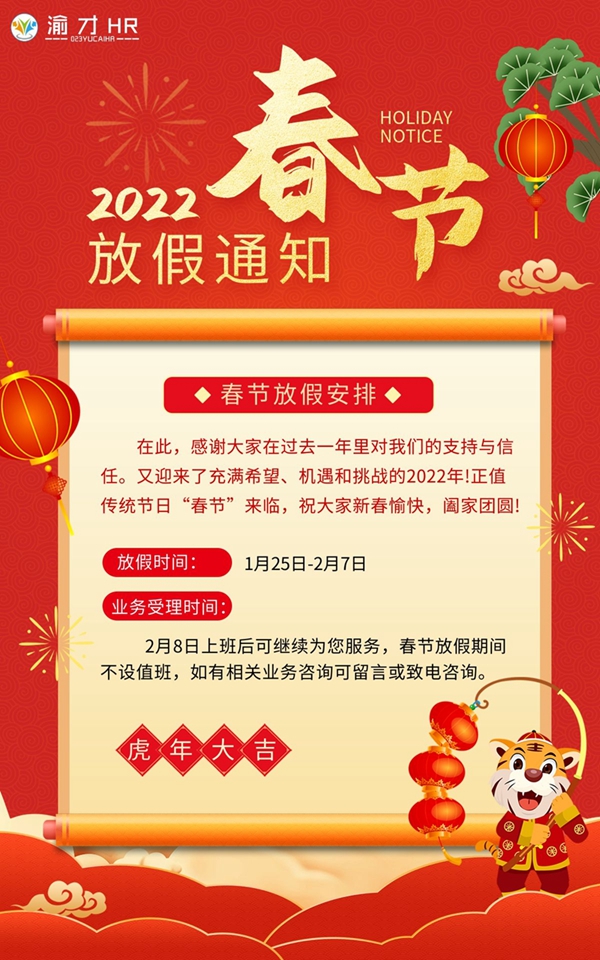 摘要:我司將于1月25日-2月7日進行春假放假,2月8日正常上班。放假期間如果有相關(guān)業(yè)務(wù)的咨詢,可留言或致電咨詢。在此渝才hr全體員工祝大家新春快樂!